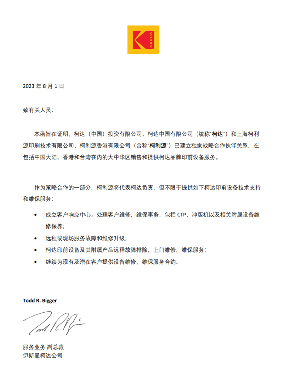 上海柯利源印刷科技有限公司Shanghai Kollyn Print Tech成立于2023年。作为柯达大中华地区(中国大陆,香港,台湾)印前CTP设备服务独家合作伙伴,柯利源依托柯达品牌的强大技术支持,独家零配件供应,由原班柯达技术服务团队,为大中华区印刷客户提供柯达印前CTP设备全面、高质量的售后服务与技术保障。